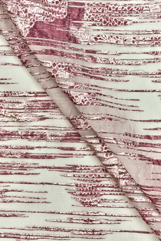 Talianska organzová tkanina v krémovej farbe so žakárovým povrchom vo forme čiar v rôznych dĺžkach a hustote distribúcie. Žakárový vzor vyrobený vo svetlej farbe červenej repy s množstvom striebornej, lesklej nite. Tkanina je priehľadná, neelastická, mierne tuhá na zakrytie. Skvelá ponuka, ktorá je ideálna pre fenomenálne večerné outfity.