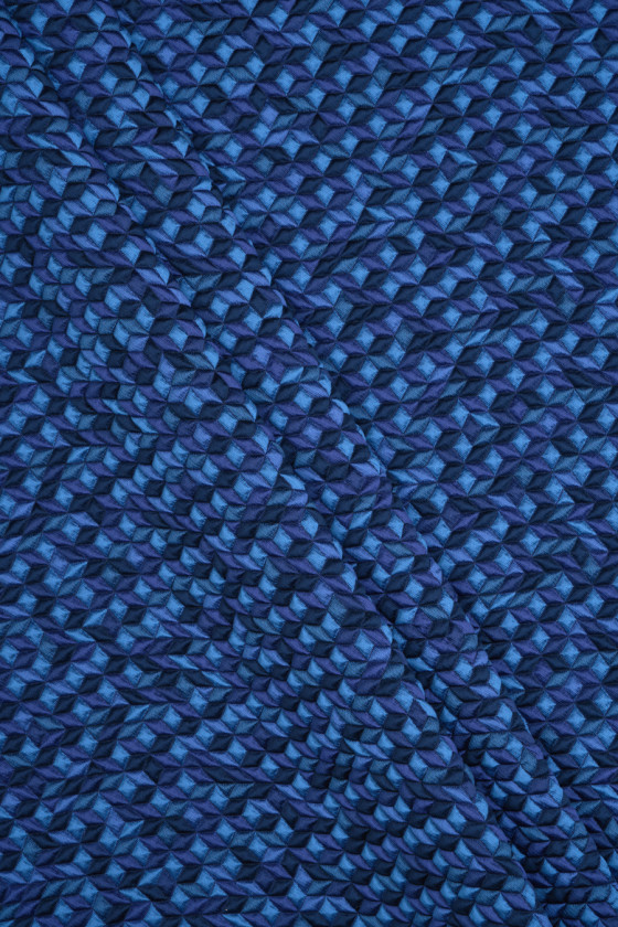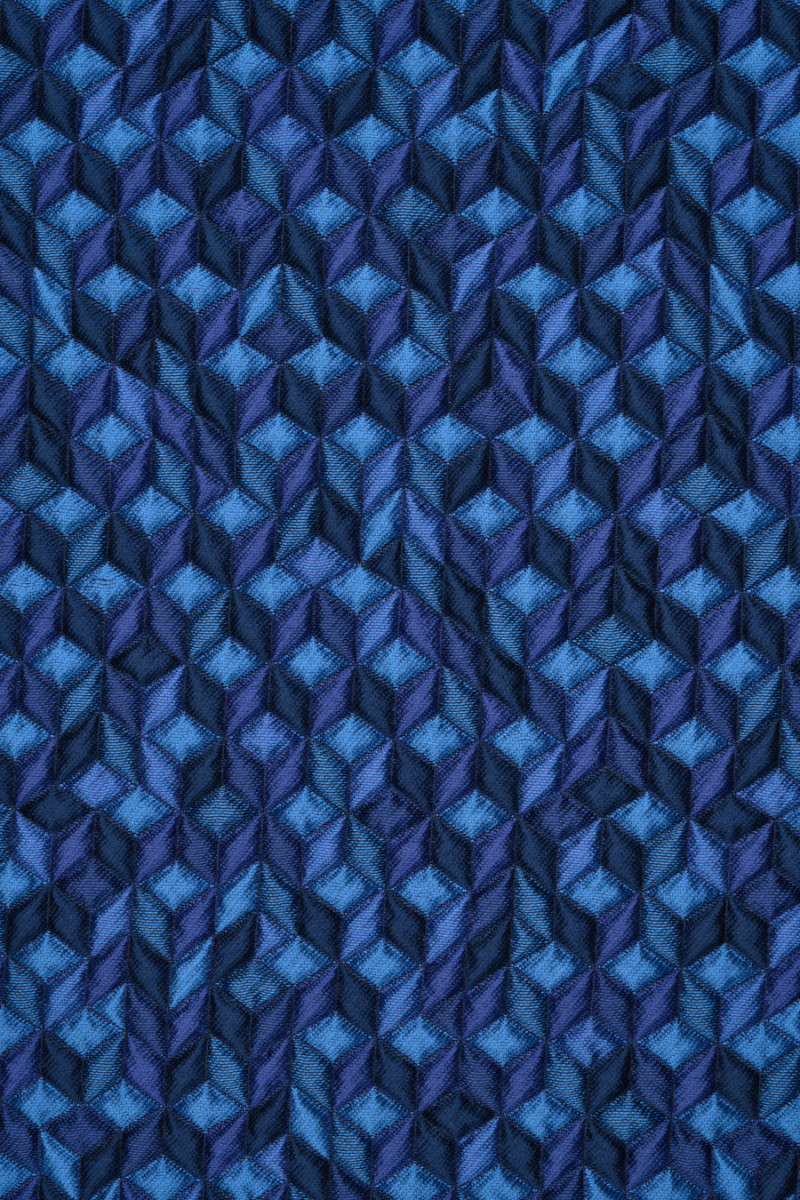 Talianska žakárová látka s malým konvexným motívom kocky v modrej, námorníckej modrej a fialovej farbe. Pravidelný vzor zložený z malého kosoštvorca s veľkosťou 8 mm * 8 mm vytvára zaujímavý 3D efekt. Látka je stredne hrubá, mäsitá, nepružná, s výraznou vypuklou štruktúrou a mierne tuhou povahou. Zaujímavý návrh na sukne, bundy, ale aj tenký kabát alebo bundu.