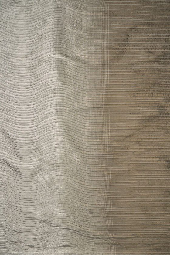 Talianska žakárová tkanina je k dispozícii v platinových pozlátených kupónoch 115 cm * 133 cm. Motív prešívania vytvára na jednom okraji látky konvexné línie v tmavšej béžovej farbe, ktoré sa na druhom okraji látky menia na vlny vo svetlejšej farbe. Šírka medzi čiarami je 1 cm. Látka je dosť tenká, ale nepriehľadná, sedí ako taft - mierne tuhá a nepružná. Fantastický návrh v pokojnej, ale elegantnej farbe na šaty, sukne, saká.