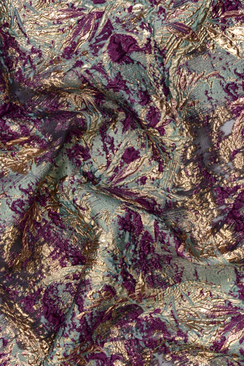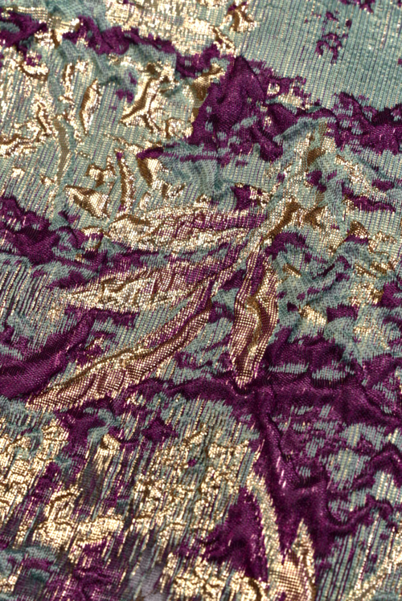 Žakárová látka zobrazujúca abstraktné, vypuklé motívy vo fialovej a zlatej farbe na šalviovom pozadí. Celok je husto tkaný na čiernej organzovej tkanine, každých 30 cm je fragment samotnej organzy, ktorý je priehľadný a nepravidelný, a jeho veľkosť je asi 14 cm v najširšom mieste a asi 24 cm v najdlhšom mieste. Látka je tenká, neelastická, zvyčajne nepriehľadná, mierne tuho sedí a zlatá niť dodáva krásny lesk. Oslnivý materiál, ktorý bude vyzerať skvele na večerných outfitoch, ako sú šaty, sukne, bundy. Môže byť tiež použitý ako dekoratívna látka.