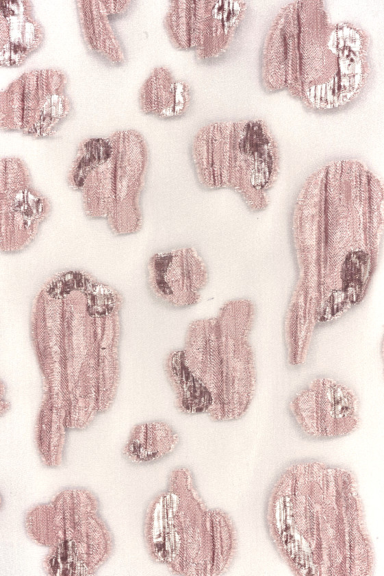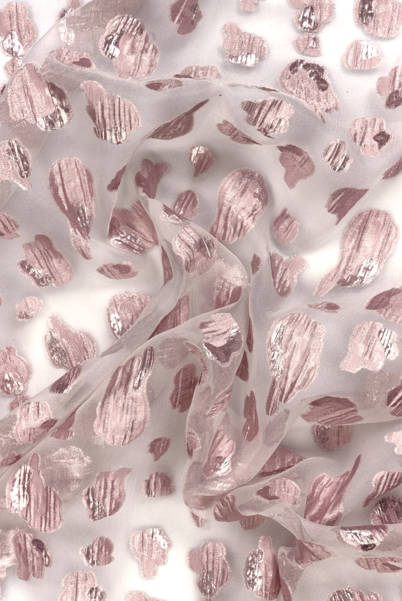 Polyesterová organza s ružovým žakárovým motívom škvŕn. Vzory rôznych veľkostí sú husto a nepravidelne usporiadané a mierne konvexné a organza je bohato zakončená jemnou striebornou niťou. Najväčšia škvrna je 5 cm * 10 cm a najmenšia je 2 cm * 2,5 cm. Látka je priehľadná, tenká, neelastická, mierne tuhá a krásne lesklá. Skvelý návrh na večerné šaty, sukne alebo blúzky.