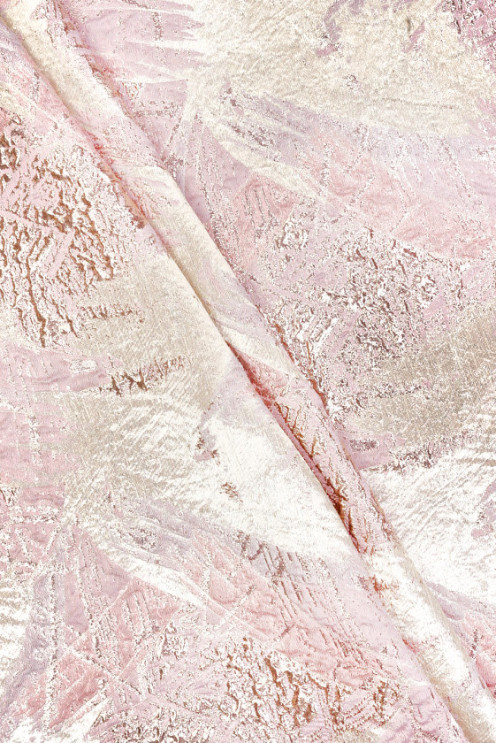 Polyesterová žakárová tkanina s motívom svetloružových a zlato-ružových prvkov na svetlom, perleťovo béžovom pozadí. Vzor je pomerne veľký, hustý a jednotlivé prvky sa pravidelne opakujú. Látka je neelastická, ľahká, zakrýva sa pomerne tuho, tenká, ale nepriehľadná a nádherne sa leskne. Elegantná ponuka pre ľudí, ktorí majú radi výrazné vzory v sviežich farbách. Je ideálny na šaty, sukne, kostýmy a saká.