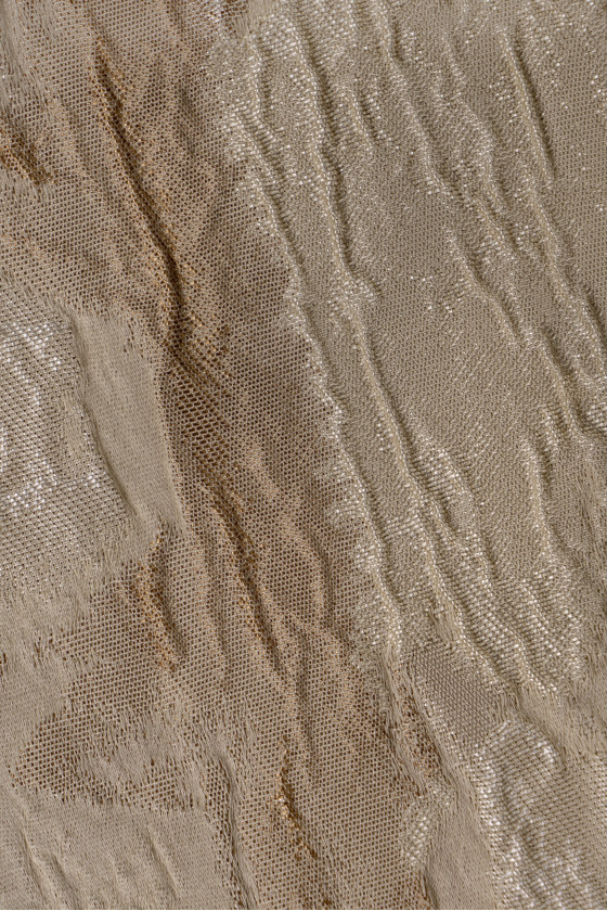 Talianska žakárová kostýmová tkanina v béžovej farbe s motívom efektných vzorov. Tkanina je mierne tuhá, zatienená, nie elastická.