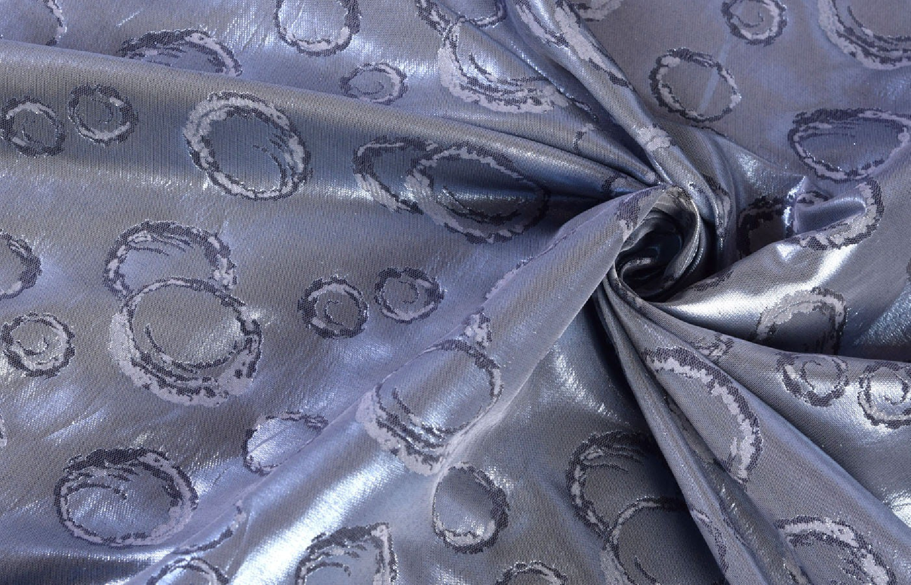 Zaujímavý žakárový návrh. tkanina Je tenký, neelastický. Farba je strieborná holubica (oceľovo modrá). Tkanina môže byť použitá na oboch stranách. Ideálne na bundy, šaty, sukne alebo tenké jarné kabáty.