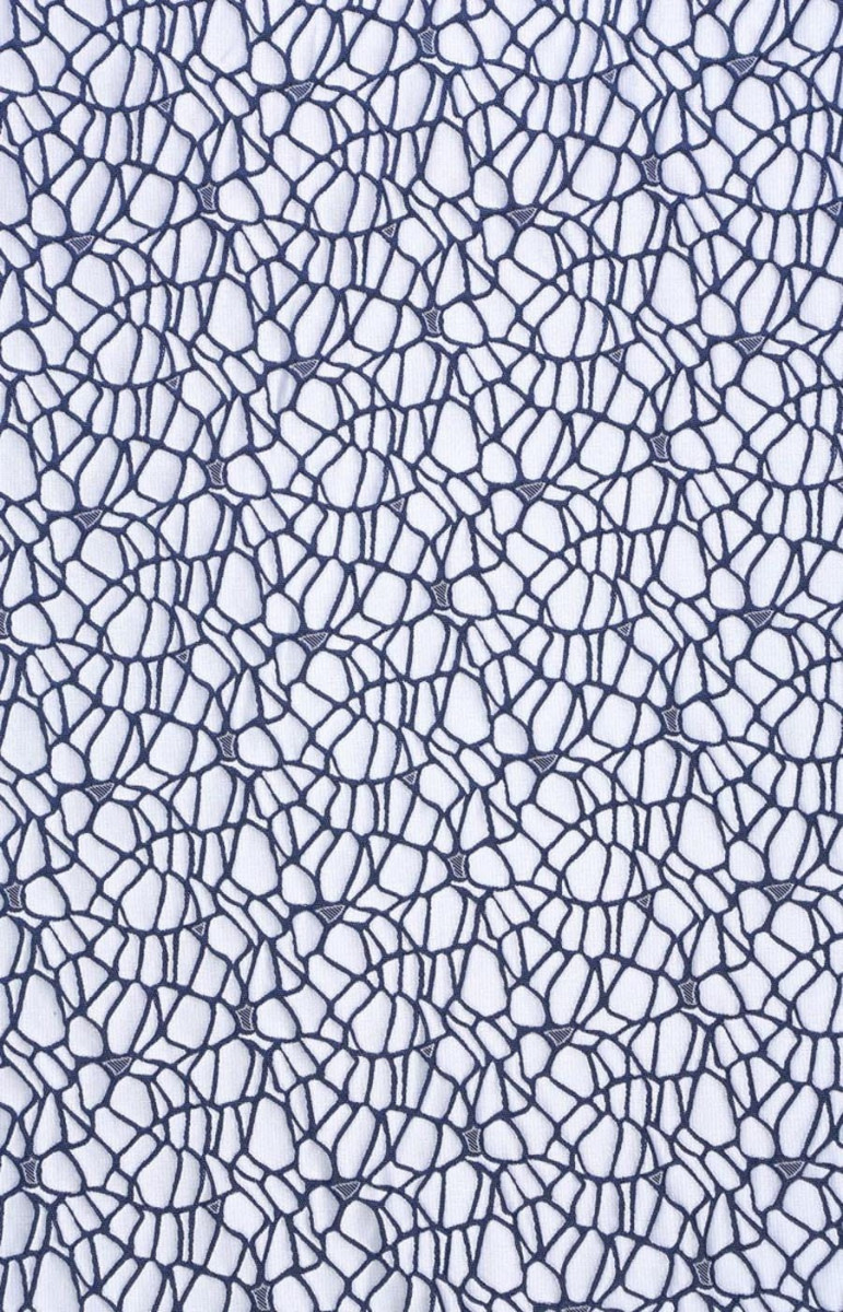 Talianska žakárová kostýmová látka v striebornej šedej farbe s tmavomodrým vzorom. Veľmi originálny motív pripomínajúci pavučinu s mierne vypuklou štruktúrou. Látka je tenká, mierne tuhá, ale veľmi plastová. Fantastický návrh na šitie šiat, sukne alebo bundy.