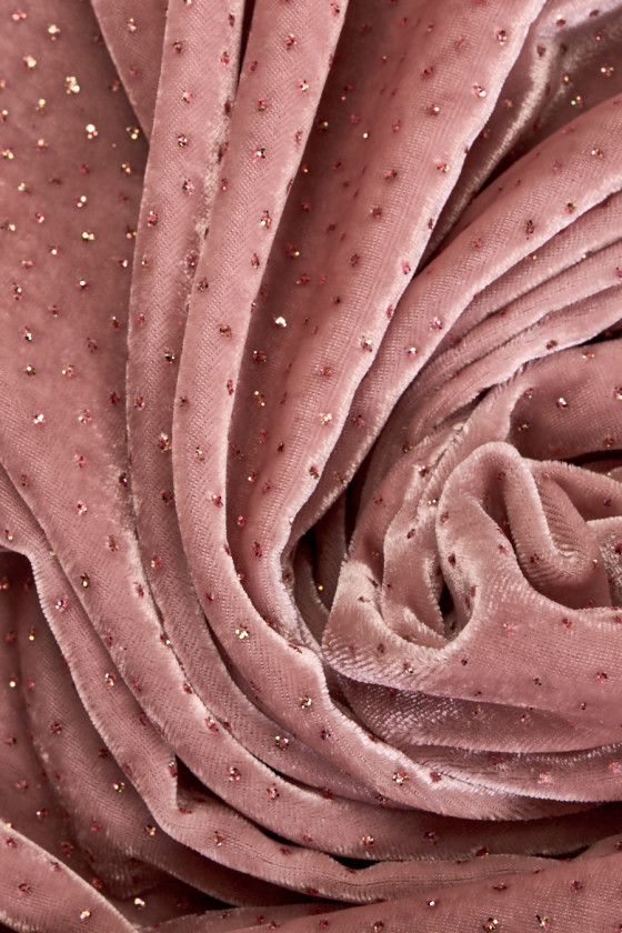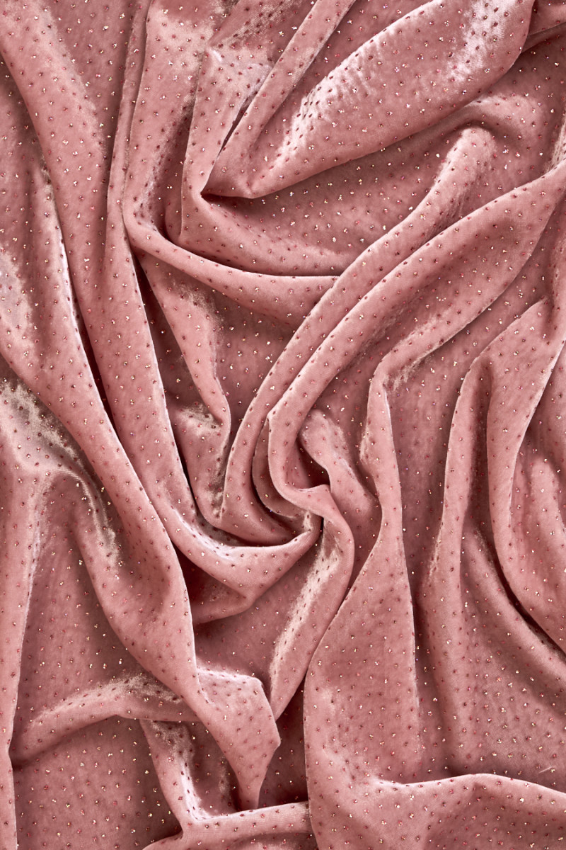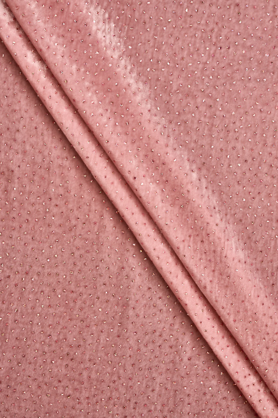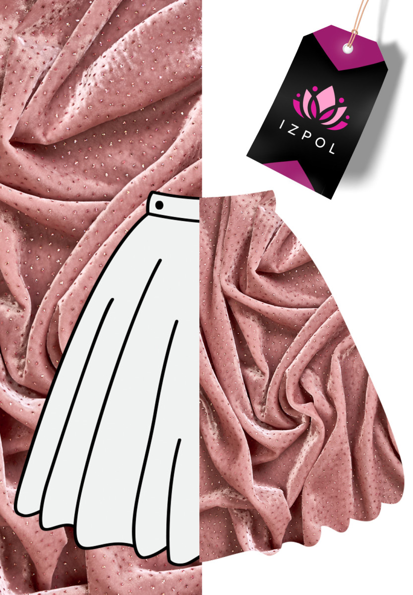 Taliansky, exkluzívny velúr v púdrovej ružovej farbe zdobený pestrofarebnými trblietkami. Tkanina je mäkká, splývavá, neelastická, tenká, ale nepriehľadná. Krásne sa zakrýva a trblietavá dekorácia dodáva látke jedinečný vzhľad. Nádherný návrh na vytvorenie spoločenských šiat, sukne alebo blúzky.