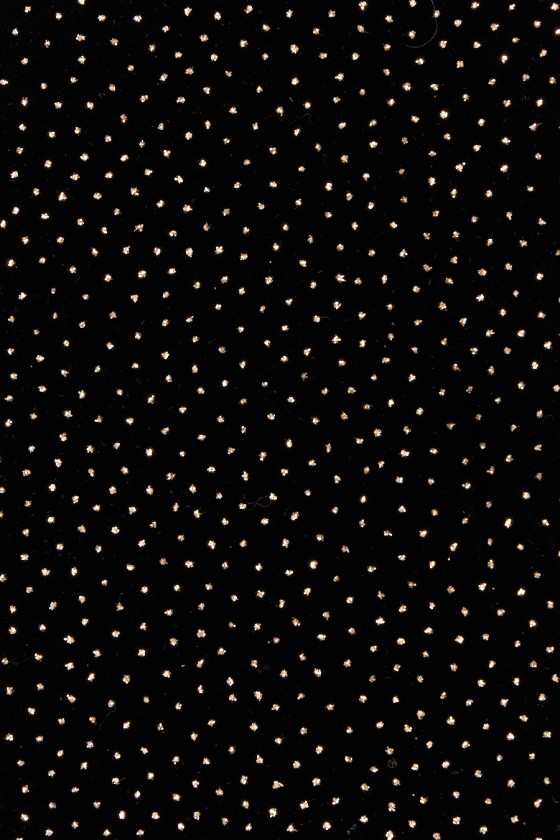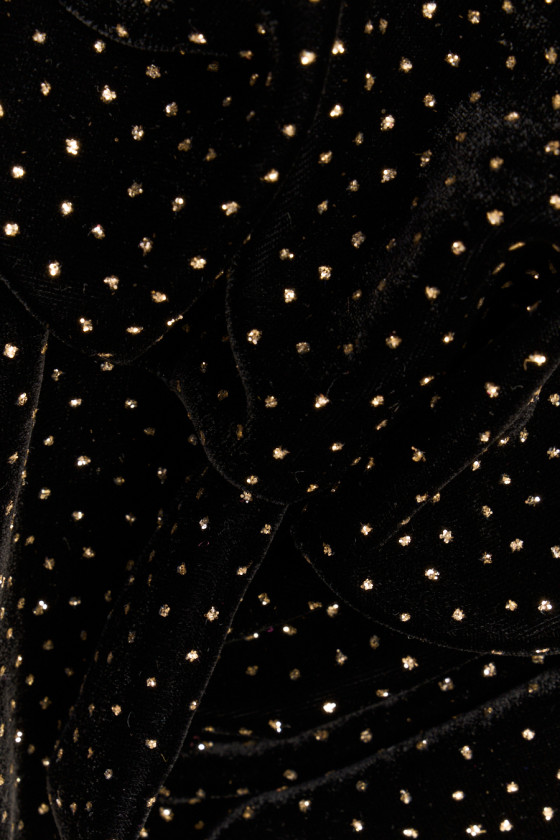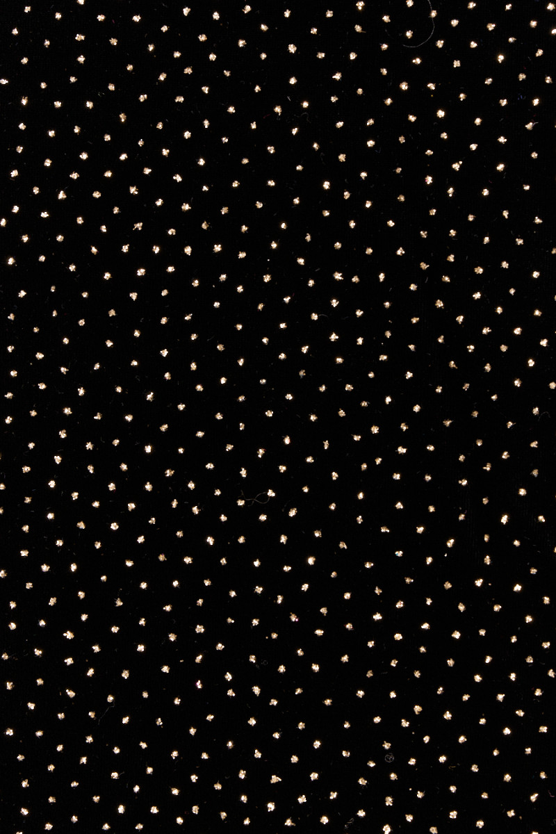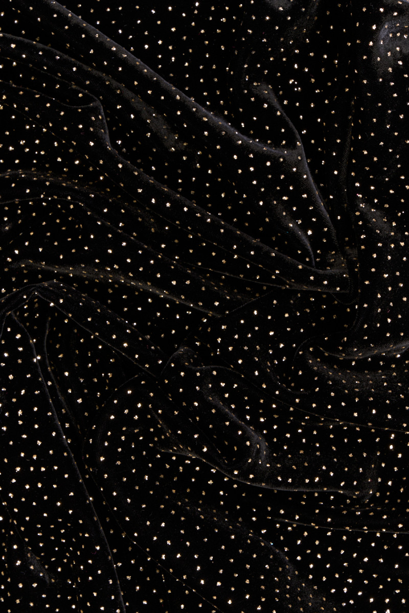 Taliansky, exkluzívny velúr v čiernej farbe zdobený jemnými zlatými trblietkami. Tkanina je mäkká, splývavá, neelastická, tenká, ale nepriehľadná. Krásne sa zakrýva a trblietavá dekorácia dodáva látke jedinečný vzhľad. Nádherný návrh na vytvorenie spoločenských šiat, sukne alebo blúzky.
