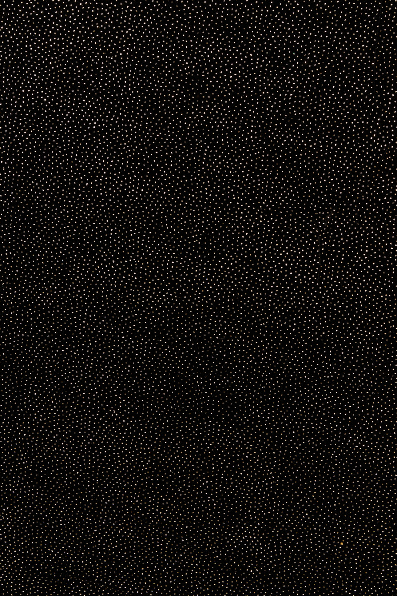 Taliansky, exkluzívny velúr v čiernej farbe zdobený jemnými zlatými trblietkami. Látka je mäkká, splývavá, neelastická, tenká, ale nepriehľadná. Krásne sa zakrýva a trblietavá dekorácia dodáva látke jedinečný vzhľad. Skvelý návrh na vytvorenie spoločenských šiat, sukne alebo blúzky. Trblietavé bodky mierne opadávajú, odporúčame vopred zmrštiť.