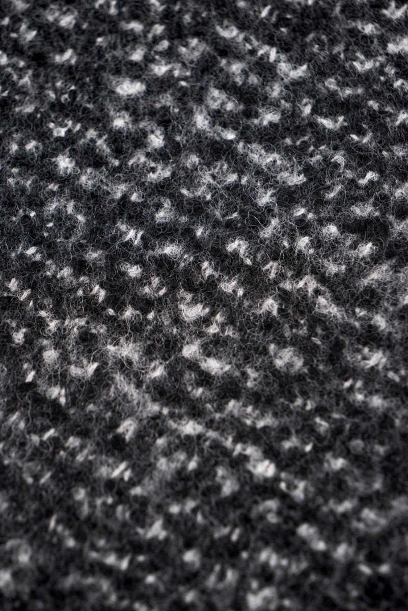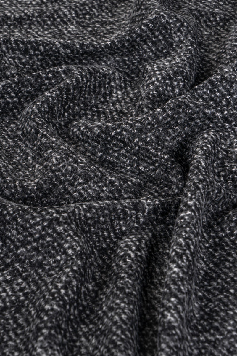 Італійська костюмна тканина, виткана з натуральної вовни з домішкою поліестеру. Кольори: меланж - сірий, чорний, екрю. Злегка жорстка, м'ясиста тканина - відмінно підійде для пошиття тонкого пальто, куртки або спідниці. Ми рекомендуємо хімчистку.
