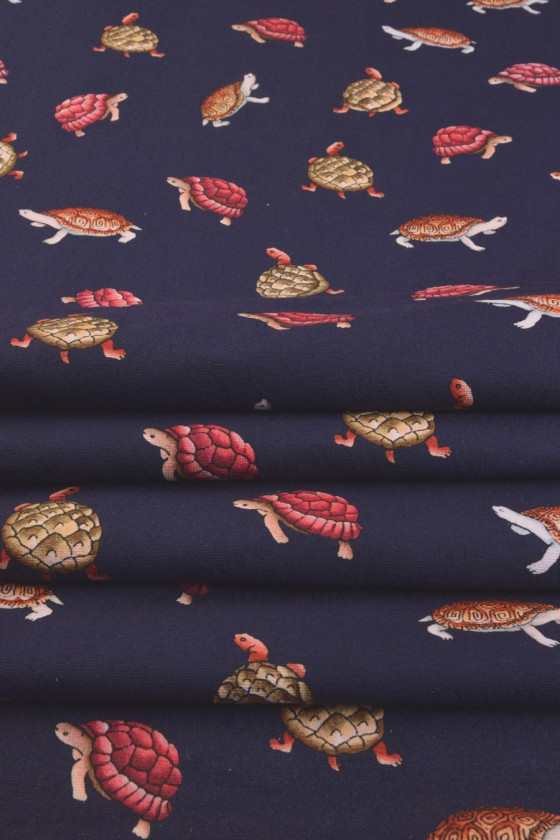 Більш щільна, темно-синя жакардова бавовна з принтом у вигляді різнокольорових черепах (розмір близько 3,5-4 см). Ми рекомендуємо його для пошиття суконь, штанів, спідниць, курток.