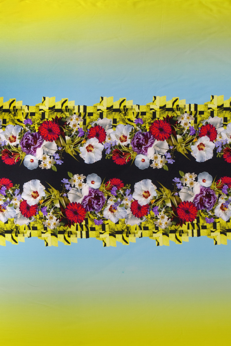 Італійська бавовняна тканина з еластаном каді. Тканина затінена (жовто-блакитна) з квітковою та геометричною смугою посередині (ширина 55 см). Тканина Cadi непрозора, м'ясиста, струмлива (важка). З його допомогою можна пошити сукні, блузи, спідниці. Тканина дуже еластична.