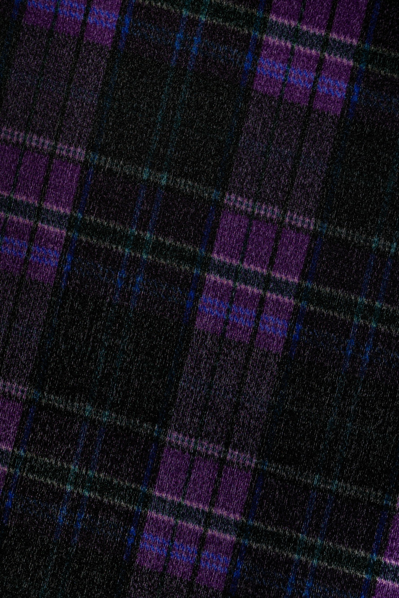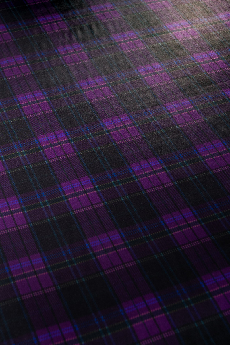Італійська бавовняна тканина з блискучим покриттям і мокрим виглядом блискіток. Чорна тканина з фіолетово-зеленим картатим мотивом (5 см). Тонка, трохи жорстка, що не еластична тканина - дуже оригінальна.