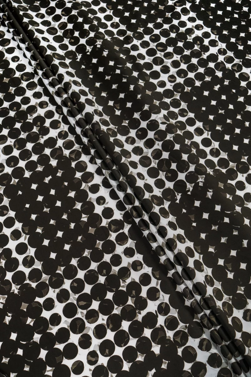 Італійська 100% бавовняна тканина кольору екрю з мотивом чорних і сірих геометричних візерунків. Бавовна - це 100% натуральне волокно. Бавовняні тканини міцні, швидко не зношуються, довго зберігають свої властивості, відмінно пропускають повітря, пропускають повітря, що дає високий комфорт використання. Нееластична, матова, непрозора тканина - відмінно підійде для пошиття сукні, сорочки, спідниці або шортів.
