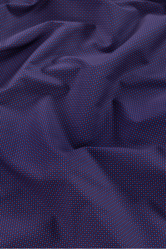 Італійська сорочка бавовна темно-синього кольору з дуже дрібним червоно-білим візерунком. Бавовна - це 100% натуральне волокно. Бавовняні тканини міцні, швидко не зношуються, довго зберігають свої властивості, відмінно пропускають повітря, пропускають повітря, що дає високий комфорт використання. Чи не еластична, матова, тонка, але непрозора тканина - відмінно підійде для пошиття сорочки, блузки або сукні.