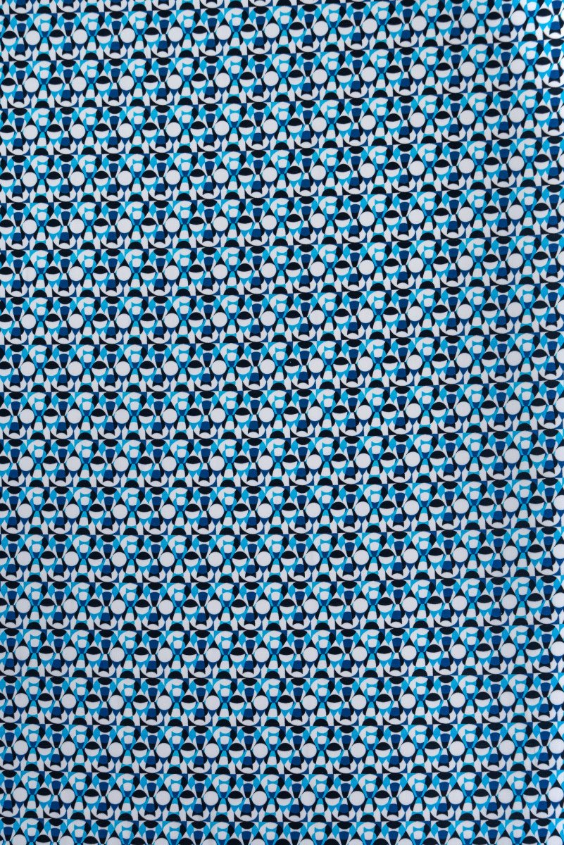 Італійська сорочка бавовняна в білому кольорі з дрібним геометричним мотивом в чорному, волошковому і синьому кольорах. Тканина нееластична, непрозора, м'яка, сильно не мнеться. Відмінно підійде для пошиття сорочки, сукні або спідниці.