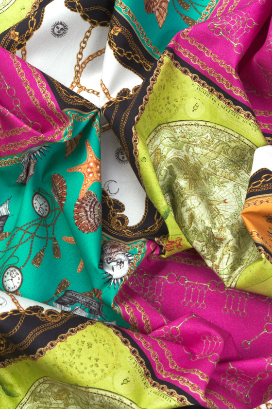 Італійська сорочка бавовняна, еластична з мотивом різнокольорових квадратів шириною 17 см, які створюють клаптиковий мотив. Тканина тонка, еластична, непрозора, злегка жорстка за розміром.