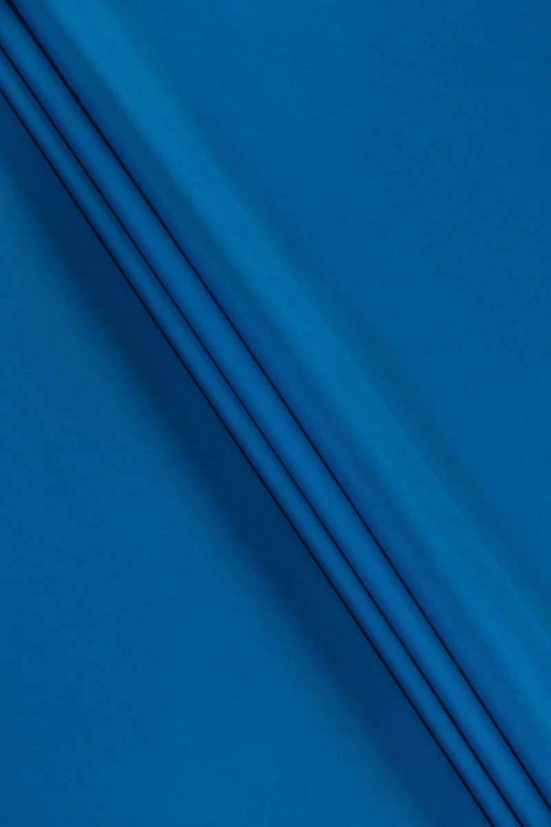 Італійська бавовняна тканина з додаванням еластану синього кольору. Еластична тканина середньої товщини і гладкого, злегка блискучого переплетення, призначена для пошиття сукні, спідниці або брюк. Натуральна тканина дуже хорошої якості, додавання еластану робить її більш комфортною у використанні і менше мнеться. Незамінна тканина навесні і влітку.