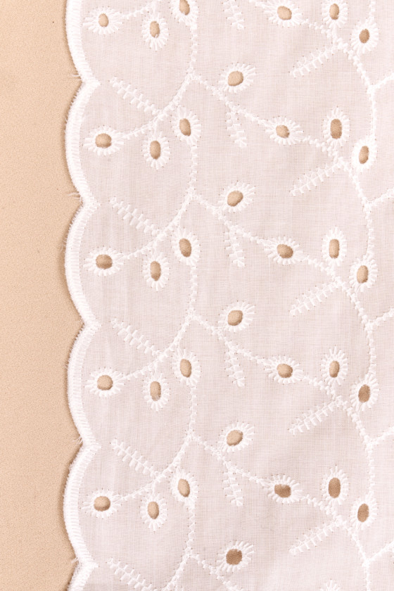 Італійська тканина 100% бавовна з вишивкою Рішельє білого кольору. Мотив крихітних квіточок, розташованих гілочками, візерунок правильний і щільний. Тканина тонка, злегка прозора, нееластична, має гарно оброблені обидва краї. Чудова, легка пропозиція для блузок, сорочок і суконь.