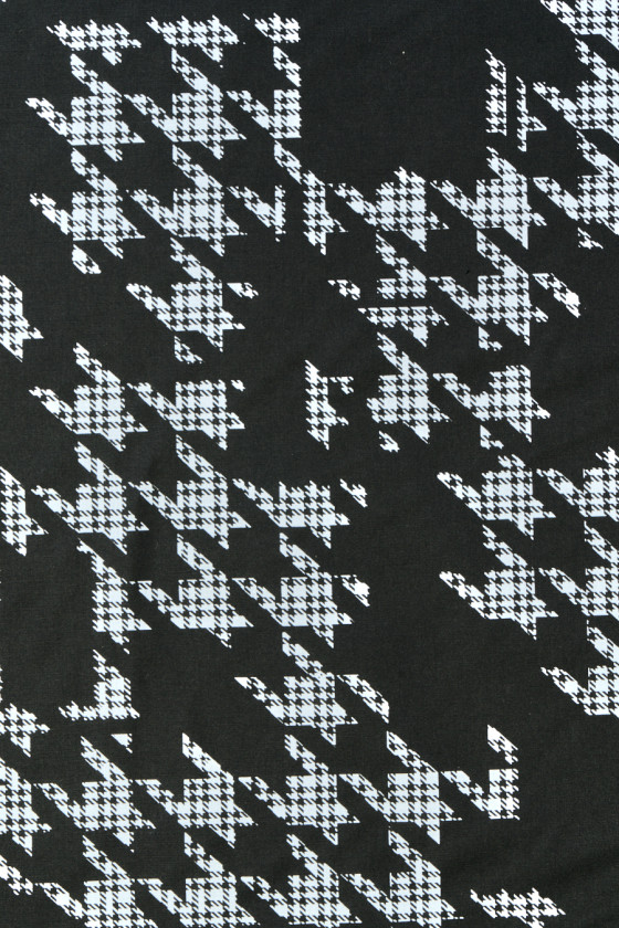 Італійська сорочкова тканина, бавовна з додаванням еластану з мотивом курячої лапки на дуже темному, коричневому тлі. Малюнок щільний і виконаний в білому кольорі. Тканина тонка, досить непрозора, трохи жорстка і еластична. Він ідеально підходить для сорочок, блуз, суконь.