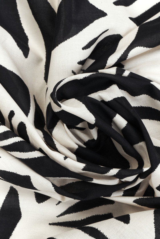Італійська 100% бавовняна тканина з мотивом дуже великих квітів, виконана в кольорі екрю на чорному тлі. Квіткові візерунки, розташовані досить густо у вигляді обрисів квіткових бутонів, стебел і листя, де окремі квітки мають розмір від 21 см до 35 см. У зв'язку з положенням малюнка ми рекомендуємо накладення окружних швів. Тканина з гладким переплетенням, тонка, злегка прозора, повітряна і не еластична. Вона відмінно підійде для довгих суконь і спідниць, а також блуз, футболок і сорочок.