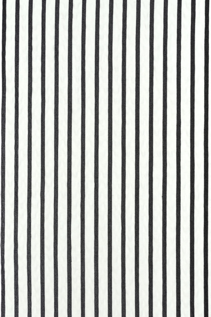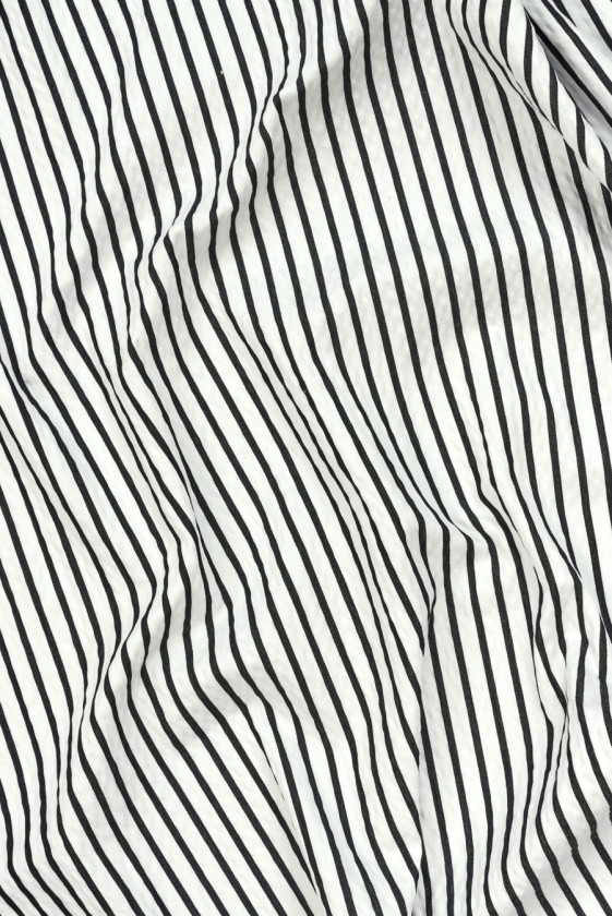 Італійська бавовняна тканина з додаванням поліестеру та еластану в наймоднішому смугастому візерунку цього сезону. Візерунок розташований вертикально білим і чорним кольорами, смуги шириною 0,4 і 0,8 см. Тканина злегка еластична із середньою товщиною і дуже цікавим, рифленим (зім'ятим) переплетенням, призначена для пошиття сукні, спідниці, сорочки або широких штанів. Натуральна тканина дуже хорошої якості, додавання поліестеру та еластану робить її більш комфортною у використанні та менше мнеться. Незамінна тканина навесні і влітку.