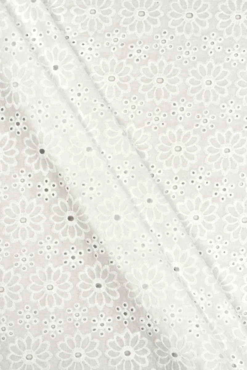 Італійська 100% бавовняна тканина з вишивкою Рішельє білого кольору. Візерунок складається з двох видів квітів розмірами 2,5 см і 5 см, які розташовуються рядами, утворюючи вертикальні смуги. Тканина матова, нееластична, злегка прозора з легкою структурою. Матеріал виготовлений з 100% натуральних волокон, тому є відмінним варіантом для пошиття літнього одягу, такої як блузка, плаття або спідниця.