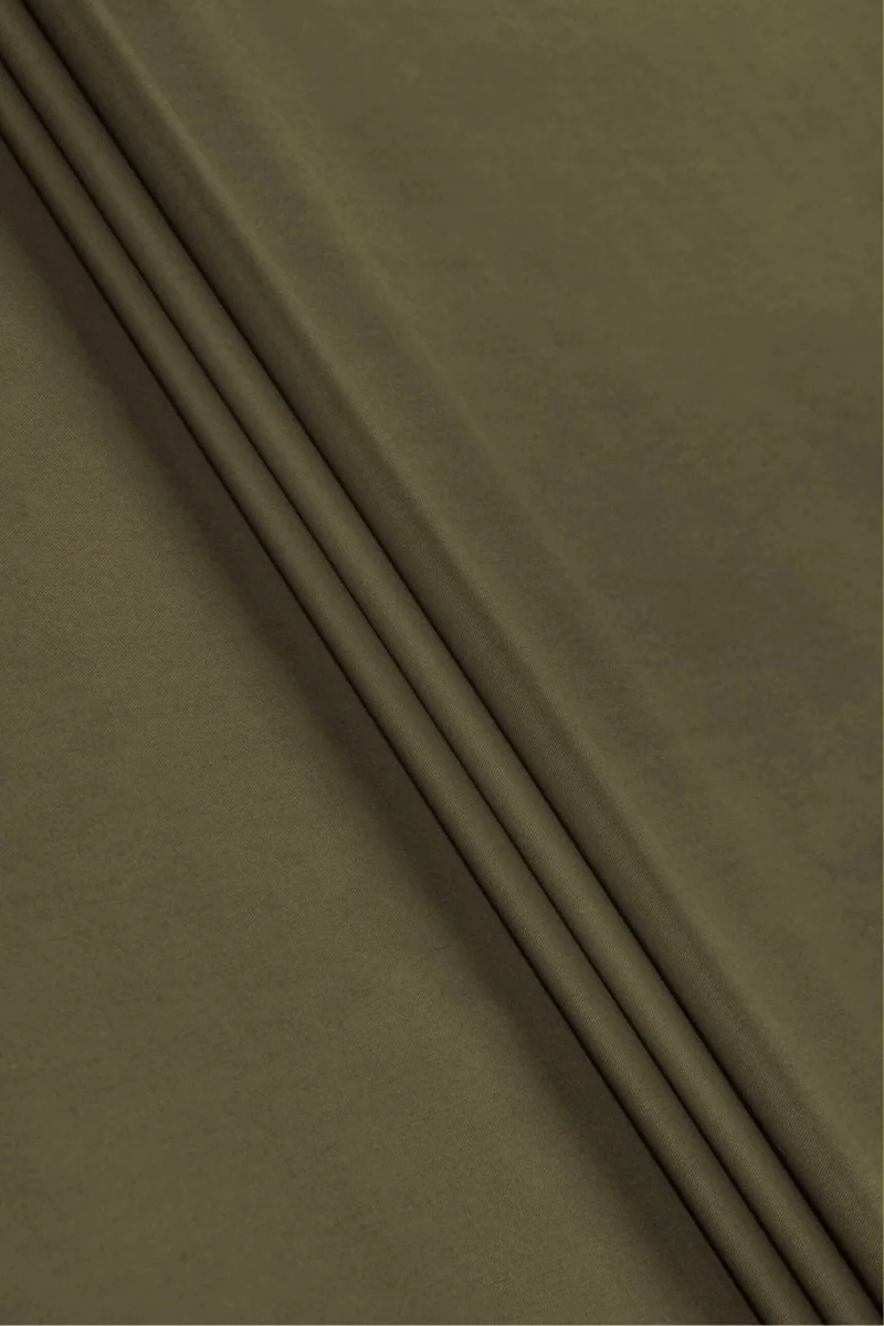Італійська бавовняна тканина кольору хакі. Тканина трохи еластична, середньої товщини з тугою та делікатною саржею. Вона матова і лежить досить жорстко, як і джинсові тканини. Природна тканина дуже якісної якості, яка ідеально підійде для шиття штанів, катани, спідниці, а також сукні.