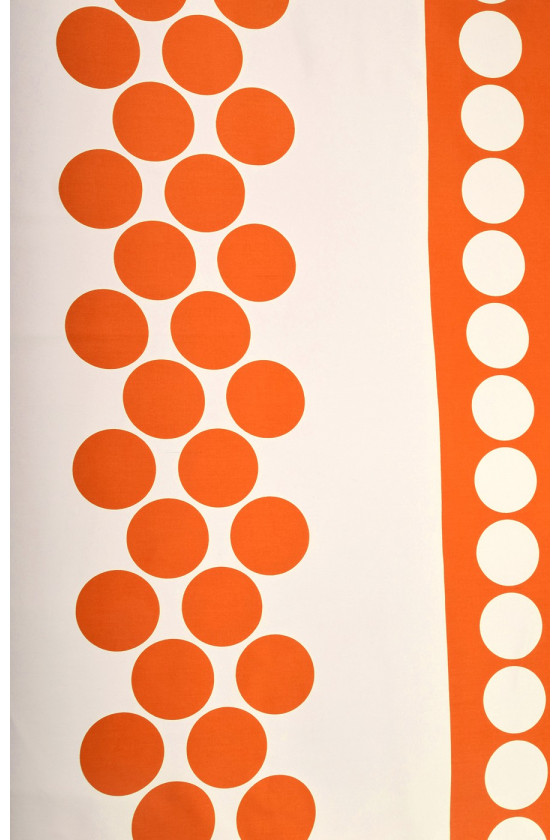 Більш щільна натуральна бавовна з еластаном в купоні 150 см * 60 см, нижня талія - білі кружечки (7,5 см) на помаранчевому тлі 14 см. Рекомендується для пошиття літніх спідниць, шортів, суконь.