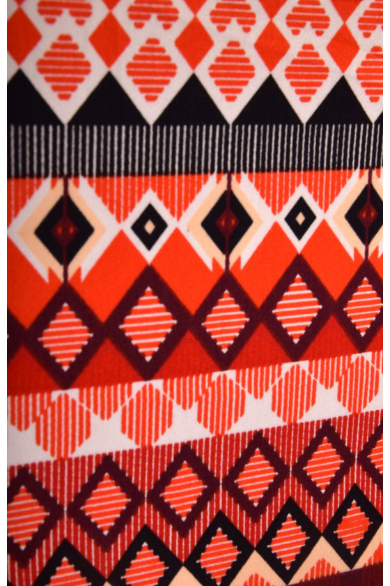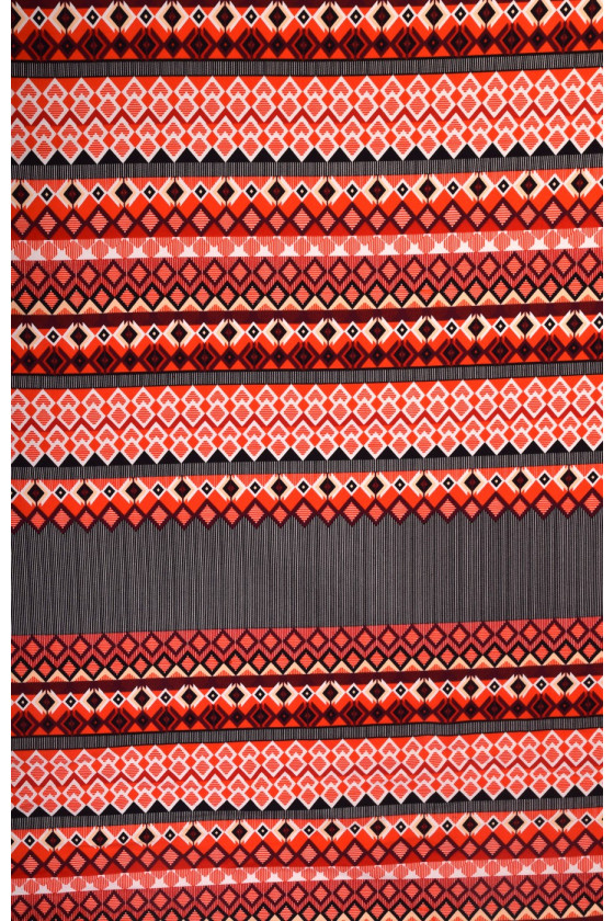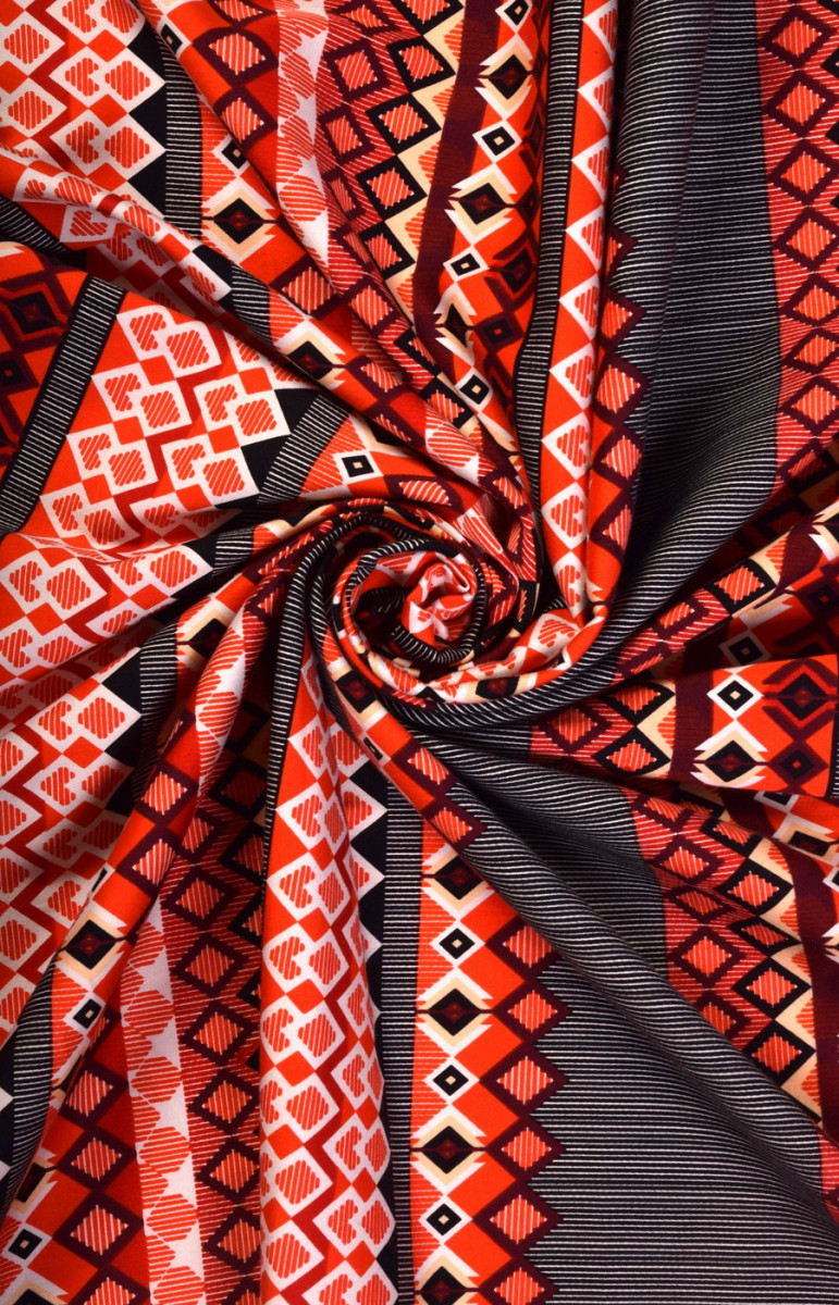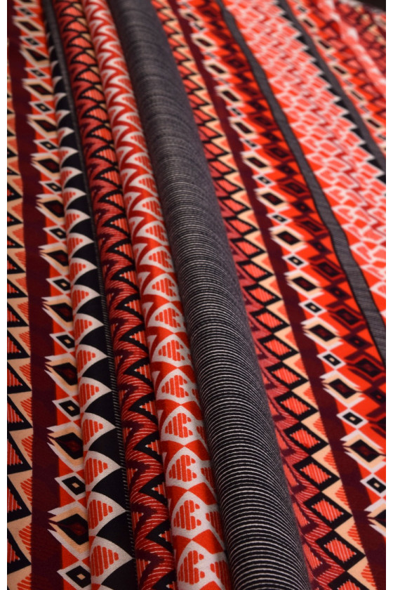 Італійська бавовняна тканина з домішкою еластану з дрібними, геометричними візерунками, розташованими горизонтальними смугами чорного, кремового і червоного кольорів. Еластична, м'ясиста, непрозора і м'яка тканина - відмінно підійде для пошиття сукні, спідниці, брюк або шортів.