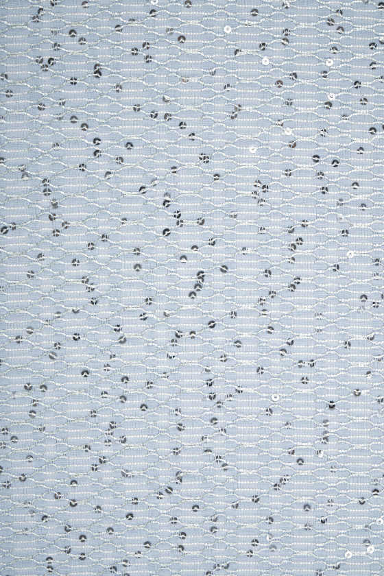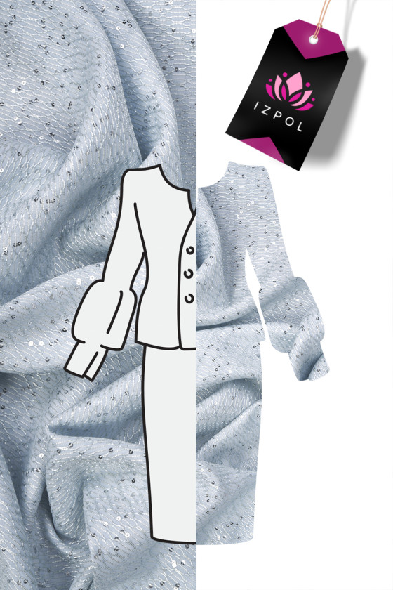 Італійська костюмна тканина Шанель крижано-блакитного кольору. Гладка тканина з пришитою сіткою і прикрашена дрібними паєтками. Тканина середньої товщини, нееластична, злегка жорстка. Відмінно підійде для пошиття сукні, спідниці або в декоративних цілях.