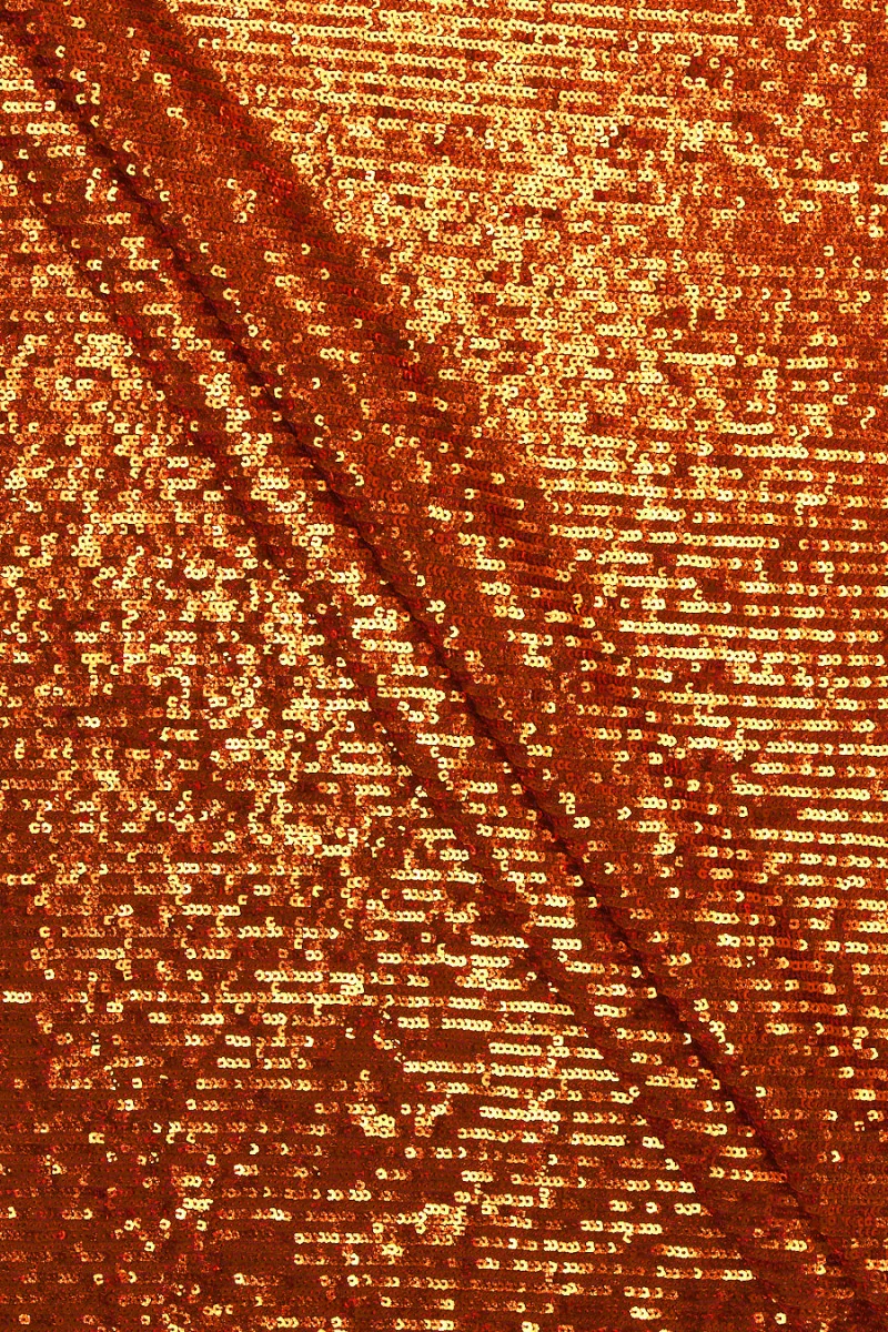 Італійська вечірня тканина рідкісного оранжево-червоного кольору. Красиві, дрібні, блискучі паєтки, щільно пришиті на еластичну сітку одного кольору (ряд за рядом без перерви, щоб вони не розійшлися при розтягуванні і не покривали тюль). Важка, красиво блискуча тканина, еластична по довжині - відмінно підійде для пошиття одягу вузького, приталеного крою. Фантастична пропозиція для людей, яким подобаються оригінальні кольори, які люблять виділятися в натовпі.