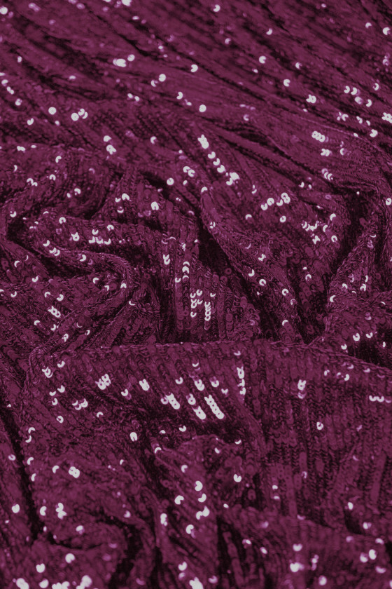 Італійська вечірня тканина дуже оригінального кольору темного, приглушеного фіолетового. Красиві, дрібні паєтки пришиті на еластичну сітку. Тканина щільна, красиво блискуча, еластична по довжині. Прекрасна пропозиція для людей, які люблять оригінальні та модні кольори.