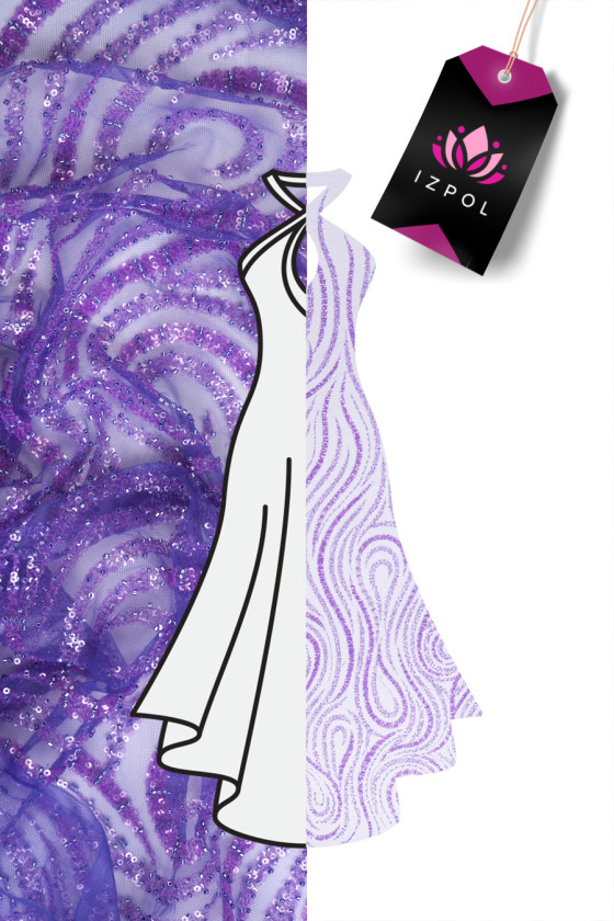 Італійська вечірня тканина фіолетового кольору. Жорсткий тюль такого ж кольору рясно прикрашений бісером і паєтками двох відтінків фіолетового, які розташовані у вигляді хвиль. Вони товщають у напрямку до одного краю тканини - прошиваємо по колу. Фантастична пропозиція для пошиття вечірньої сукні в наймоднішому кольорі. Тканина для людей, які стежать за останніми модними тенденціями.