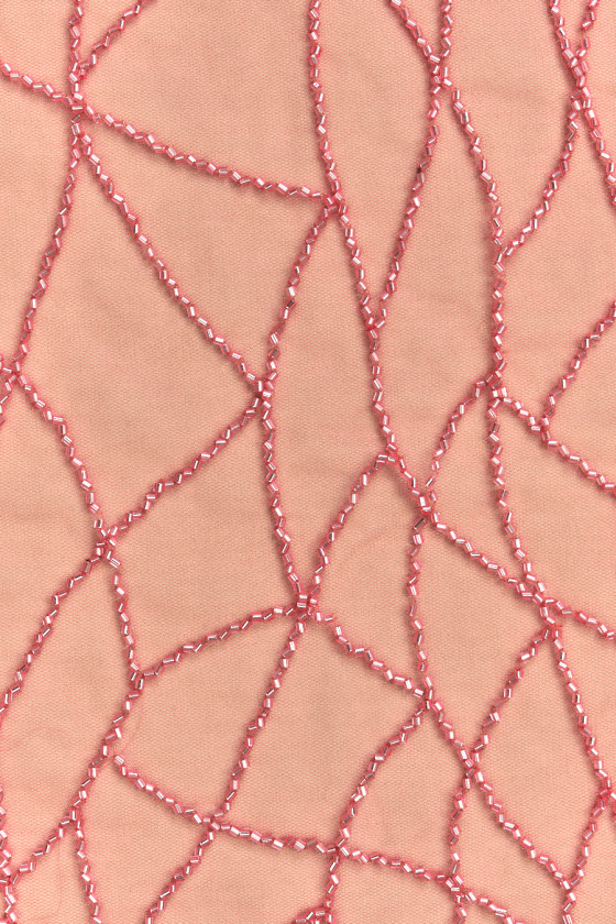 Італійський жорсткий тюль з класичними кораловими люверсами. Вона тонко прикрашена циліндричними намистинами такого ж кольору. Вони утворюють ромбоподібний геометричний візерунок, який потовщується до одного краю тканини (декоративна обробка відсутня). Тканина дуже ефектна, прозора (вимагає підкладки), важка, злегка еластична - шиємо по колу. Фантастична пропозиція для пошиття вечірньої сукні, спідниці або блузки в дуже цікавому виданні.