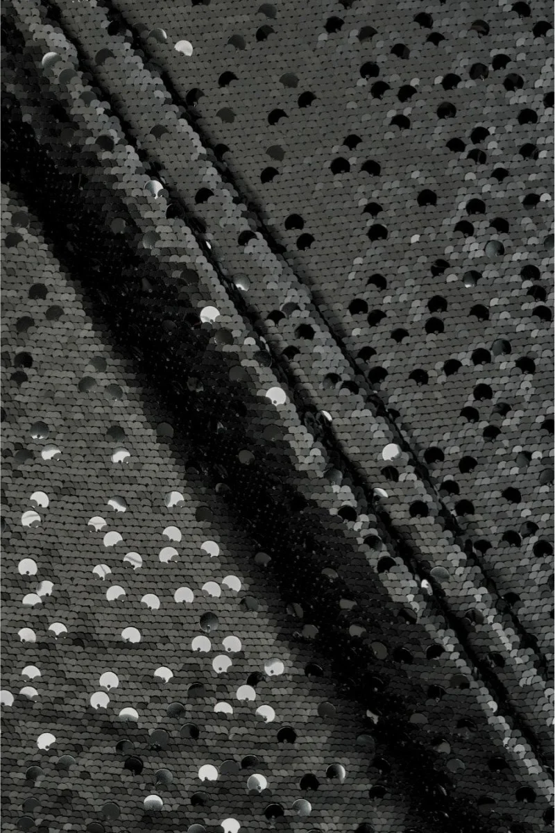 Ефектна тканина з паєтками в різних кольорах. Два види блискіток густо розташовані на еластичній сітці. Основа складається з більш дрібних матових паєток, між якими нерегулярно вшиті більші і блискучі паєтки. Тканина еластична, струмлива, непрозора, досить важка, для шиття по колу за рахунок напрямку, в якому вшиваються паєтки. Сітка має ширину 160 см, а паєтки розташовані на відстані 140 см. Позачасова пропозиція, з якої ви можете створювати сукні, спідниці, блузи або топи.