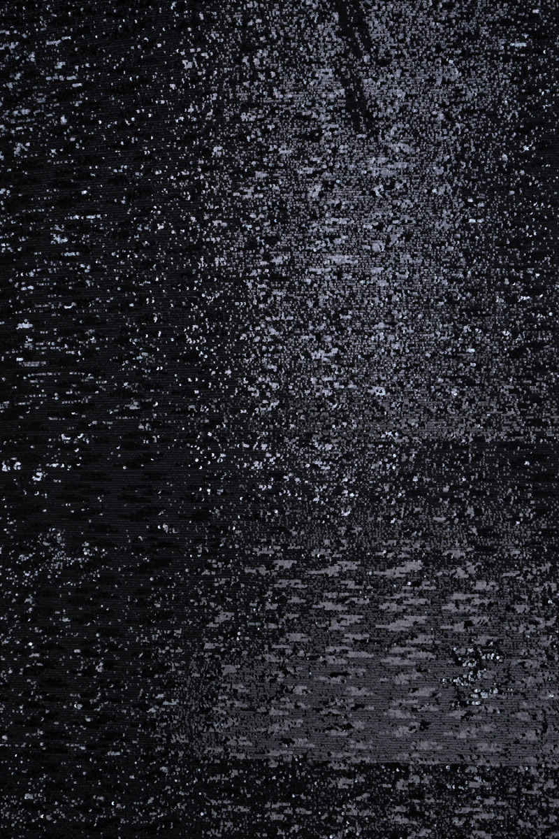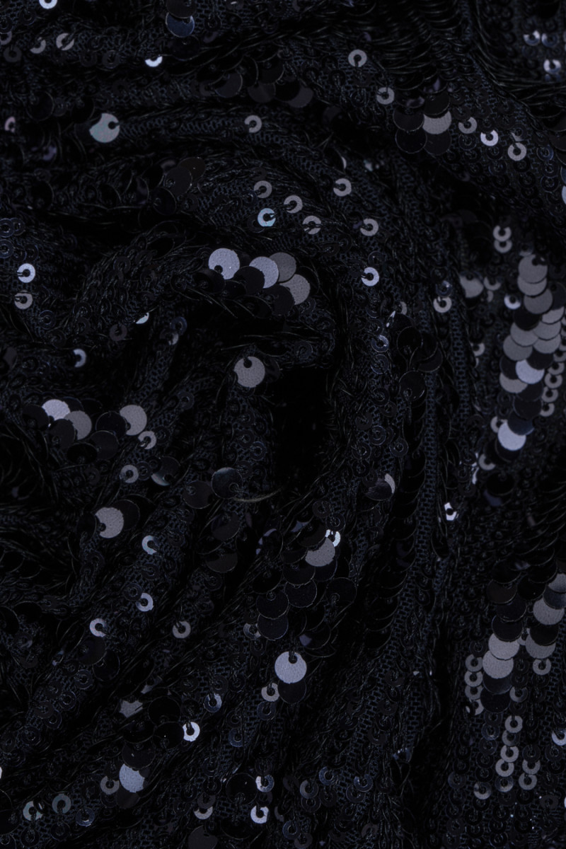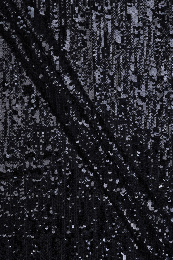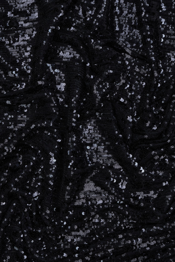 Ексклюзивна тканина з паєтками чорного, темно-синього та золотого кольорів. Два розміри паєток розміщені звичайними рядами - замовляємо окружне пошиття. Паєтки пришиті на еластичну сітку шириною 160 см, паєтки розміщені на ширині 130 см. Золоті блискітки розміщені на сітці білого кольору, решта - блискітками. Тканина еластична, злегка прозора, м'яка і легка. Відмінна пропозиція для пошиття вечірнього плаття, спідниці, блузки.