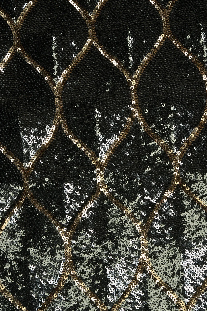 Ексклюзивна тканина з паєток з тонких, густо пришитих паєток темно-сріблястого кольору, через які регулярно проходять золоті паєтки для створення красивого візерунку. Блискучі блискітки розміщені на еластичній сітці шириною 150 см, блискітки – на ширині 133 см. Розмір одного краплеподібного мотиву – 12 см*6 см. Тканина еластична, непрозора, м'яка і досить важка. Унікальна пропозиція для пошиття вечірньої сукні, спідниці або блузки.