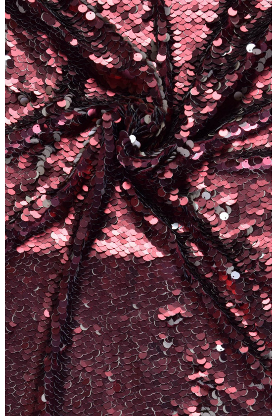 Красиві паєтки, вишиті на віскозному трикотазі. Натяжна тканина. Блискітки обертаються. З одного боку вони вишневого кольору, з іншого - бежевого. Ідеально підходить для суконь, блуз, спідниць. Тканина поставляється в двох шматках довжиною 60 см і 110 см.