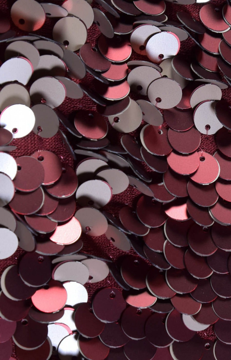 Красиві паєтки, вишиті на віскозному трикотазі. Натяжна тканина. Блискітки обертаються. З одного боку вони вишневого кольору, з іншого - бежевого. Ідеально підходить для суконь, блуз, спідниць.