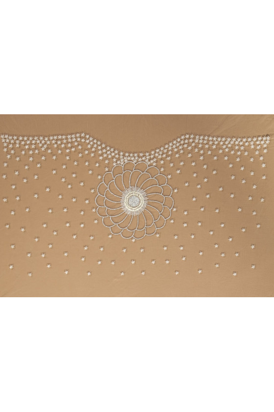 Італійська весільна аплікація у вигляді корсета (блузка - спереду). На фатин кремового кольору - в середину аплікації був пришитий великий квітка (24 см) з прозорого бісеру і паєток - центр квітки густо заповнили бісером срібла і екрю і паєтками. Верх корсета густо прикрашений дрібними прозорими квіточками - малюнок зменшується донизу.