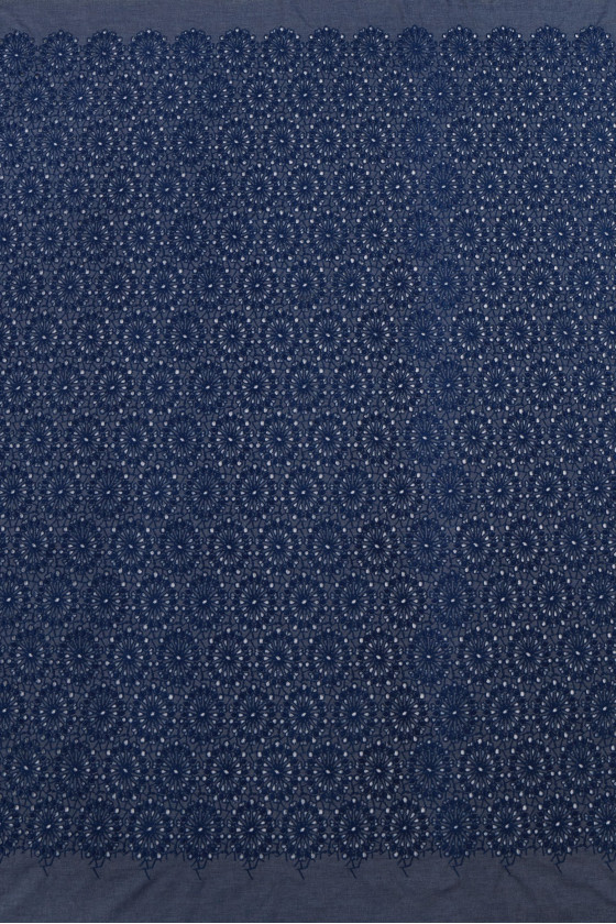Італійська бавовняна тканина, що нагадує тонкі джинси сірого та темно-синього кольорів з темно-синьою ажурною вишивкою. Ширина тканини 155 см, а сама вишивка 135 см. Злегка жорстка тканина, що вимагає підкладки - відмінно підійде для пошиття сукні, блузки, спідниці.