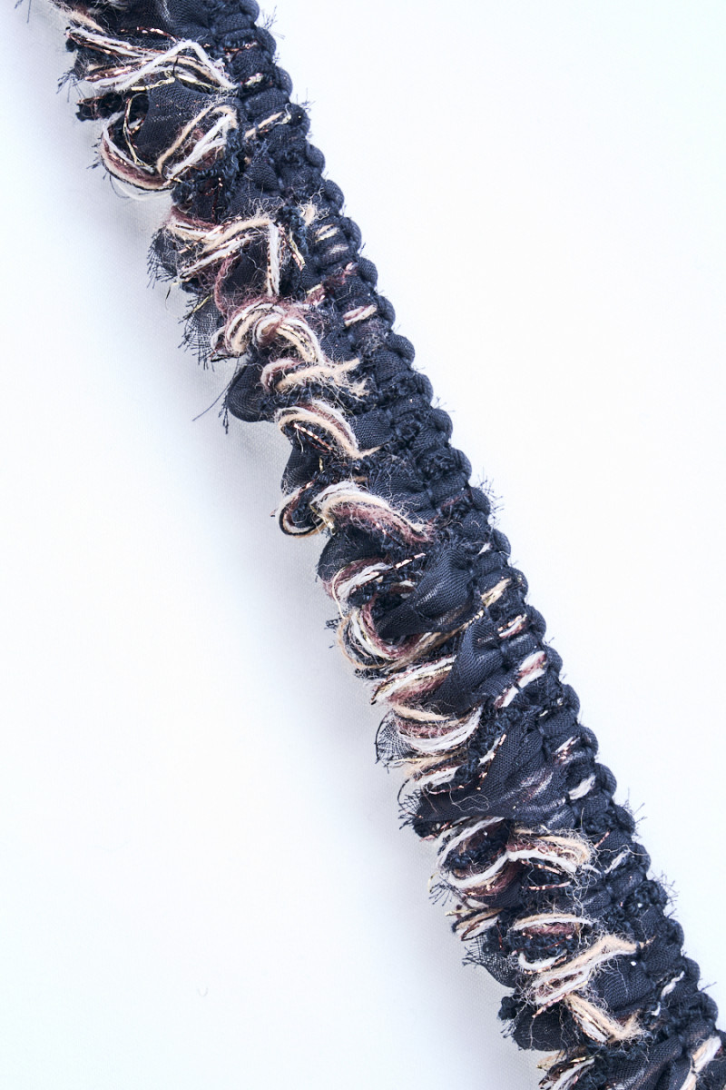 Італійська галантерейна стрічка Chanel шириною 3 см. Дуже цікаве поєднання чорного поліестеру, шифону і вовняних ниток чорного, коричневого, кремового і золотого люрексу. Ціле пришивається з одного боку і створює красиву оборку. Стрічка буде виглядати фантастично в якості обробки тканин Шанель.
