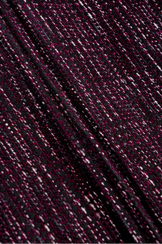 Італійська костюмна тканина в чорному кольорі з вплетеними нитками в кольорах екрю, фуксія і фіолетовий. Виткана з натуральної вовни з домішкою віскози. Злегка жорстка тканина - відмінно підійде для пошиття сукні, костюма або спідниці.
