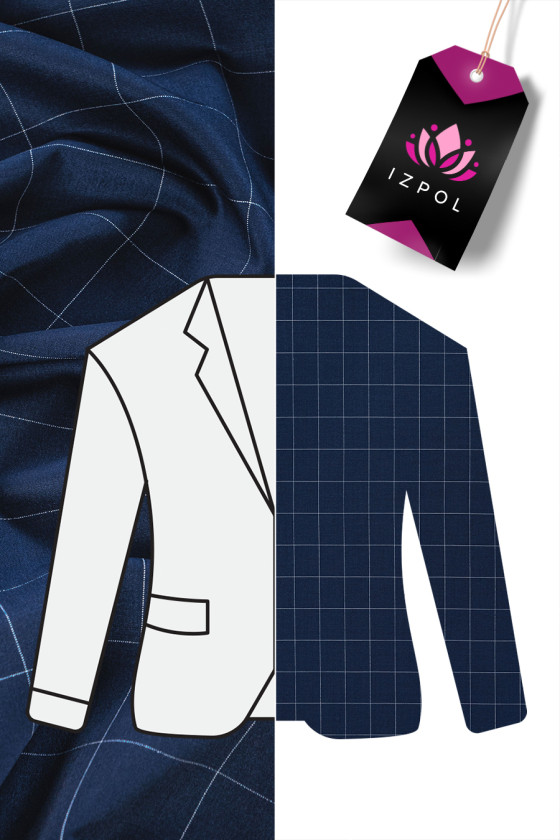 Італійська костюмна шерсть темно-синього кольору з білим картатим мотивом розміром 5 см * 4 см. Тканина середньої товщини, еластична - відмінно підійде для пошиття сукні, спідниці, костюма, брюк.