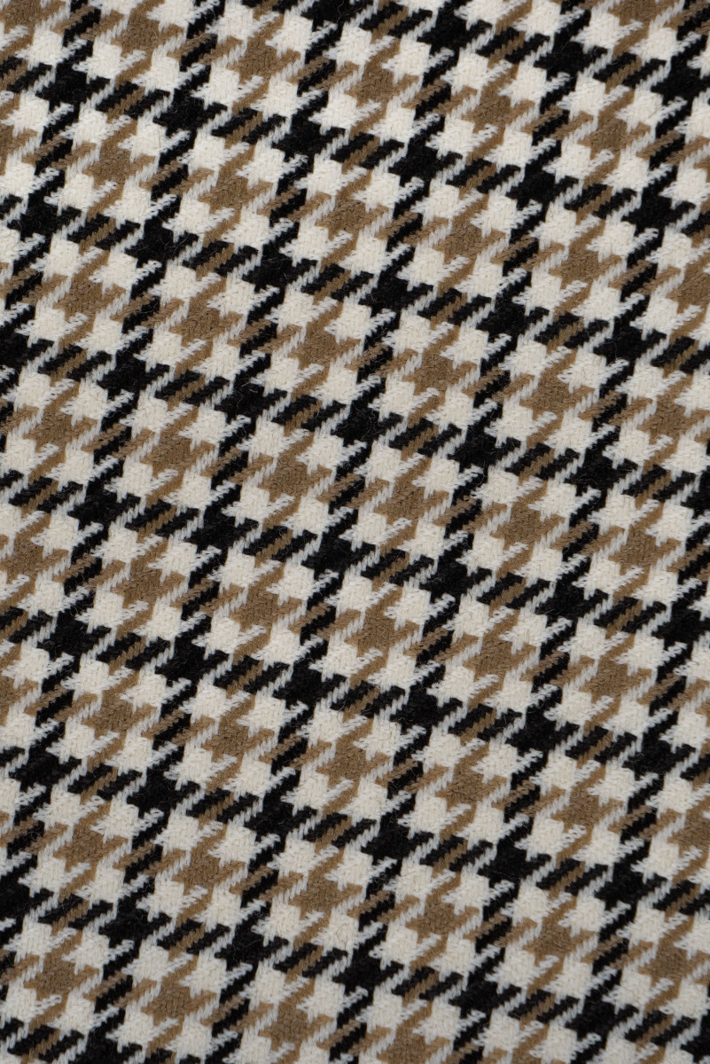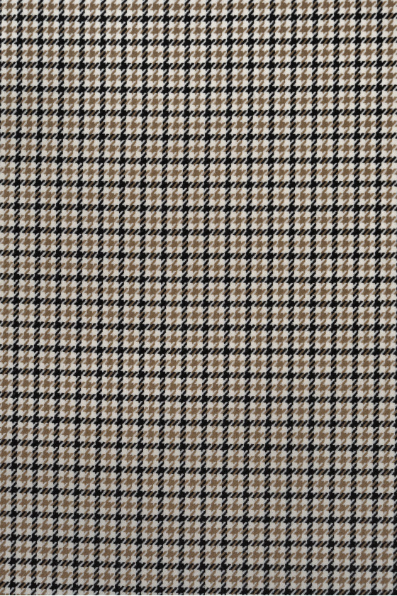 Італійська костюмна шерсть світло-бежевого кольору з дрібною клітинкою і мотивом гусячої лапки (2 см) темно-коричневого і верблюжого кольору. Більш товста, нееластична, м'ясиста тканина осінньо-зимового виду. Відмінно підійде для пошиття костюма, сукні, спідниці або жакета.