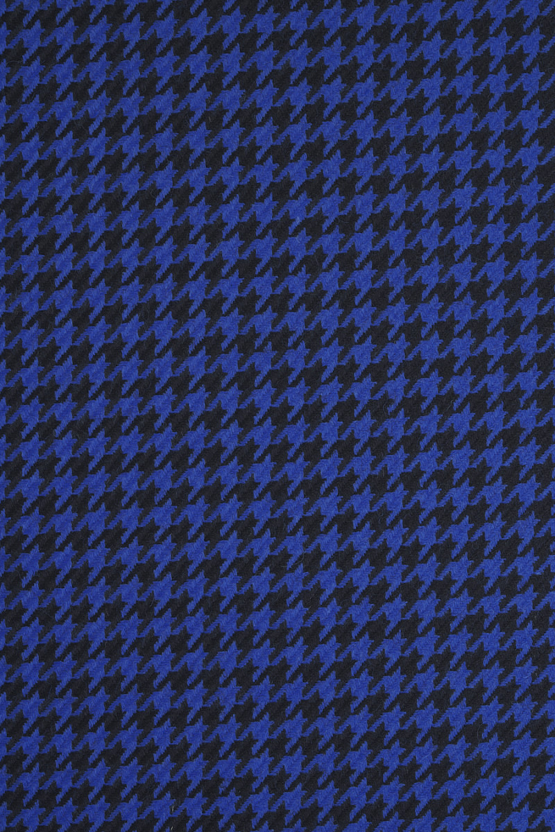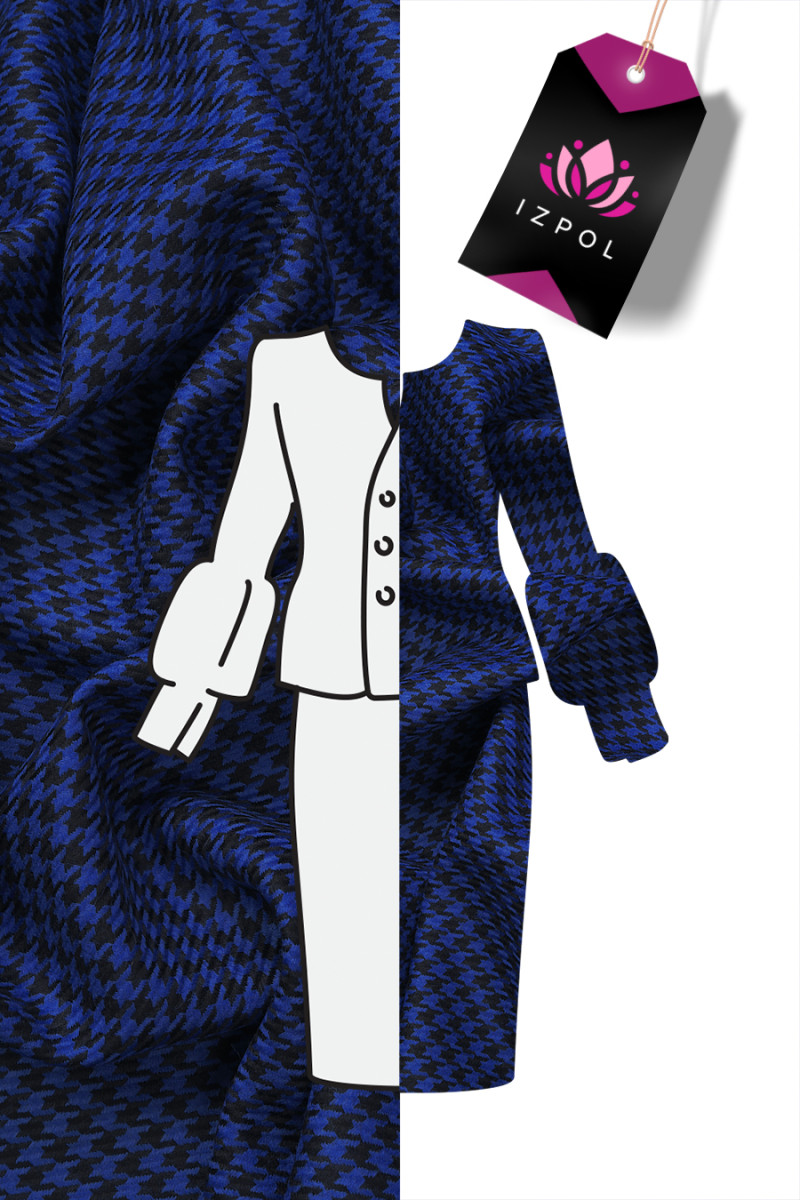 Італійська костюмна шерсть з мотивом волошково-синьої і чорної курячої лапки, розміром 1 см. Більш щільна, м'яка, нееластична тканина осінньо-зимового виду. Відмінно підійде для пошиття костюма, сукні, спідниці, брюк або костюма.