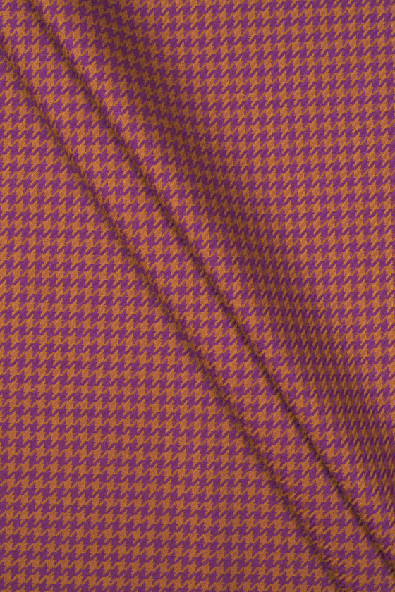 Італійський костюм з вовни з мотивом фіолетової і верблюжої курячої лапки, розміром 1 см. Більш щільна, м'яка, нееластична тканина осінньо-зимового виду. Відмінно підійде для пошиття костюма, сукні, спідниці, брюк або костюма.