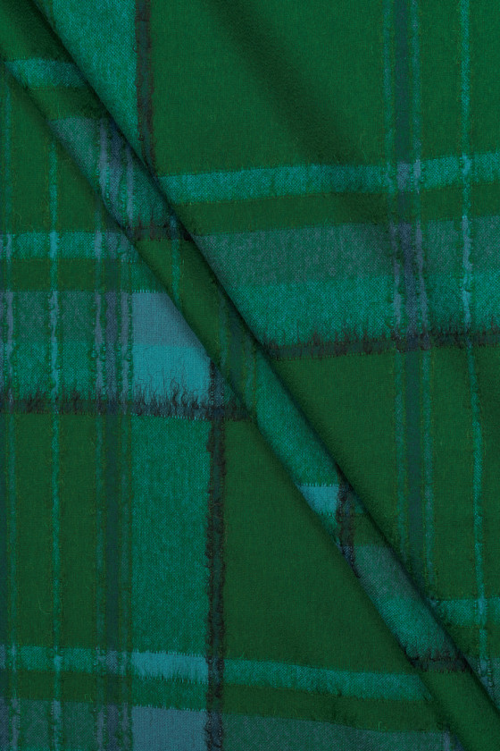 Італійська костюмна шерсть з домішкою мохеру, великий картатий мотив (близько 10 см) зеленого і синього кольорів. Тканина осінньо-зимового виду з ніжним ворсом.