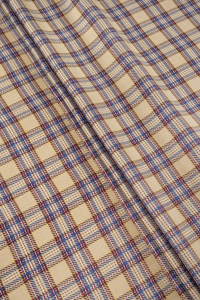 Італійська костюмна вовна світло-бежевого кольору з картатим мотивом шириною близько 5 см в бордовому, блакитному і екрю. Більш щільна, м'яка, нееластична тканина осінньо-зимового типу з широким, саржевим переплетенням. Фантастична пропозиція для людей, які люблять спокійні кольори, але оригінальні поєднання кольорів. Тканина відмінно підійде для пошиття жакета, спідниці або сукні.