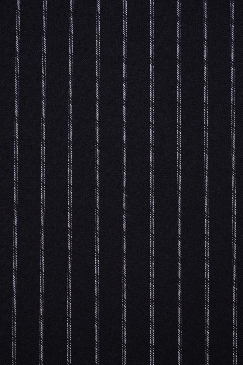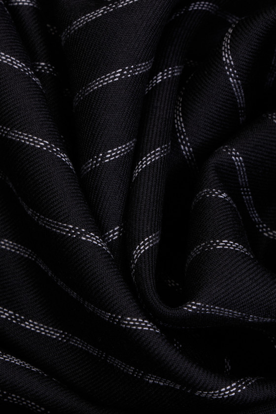 Італійська костюмна тканина, виткана з вовни чорного кольору з білими смужками. Смужки розташовуються через кожні 2 см. Тканина м'яка, м'ясиста, злегка працює на нитках, двостороння. Відмінно підійде для пошиття костюма, костюма, брюк, спідниці, сукні.